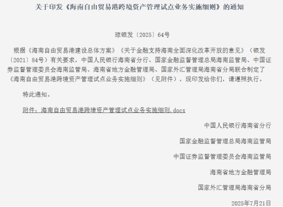 为加快推进海南自由贸易港(下称海南自贸港)跨境资产管理业务试点工作,中国人民银行海南省分行等五部门在7月21日发布《海南自由贸易港跨境资产管理试点业务实施细则》(《实施细则》),明确初期试点总规模上限为100亿元人民币,支持境外投资者投资海南自贸港内金融机构发行的理财产品、证券基金期货经营机构私募资产管理产品、公开募集证券投资基金、保险资产管理产品(下称试点资管产品)。