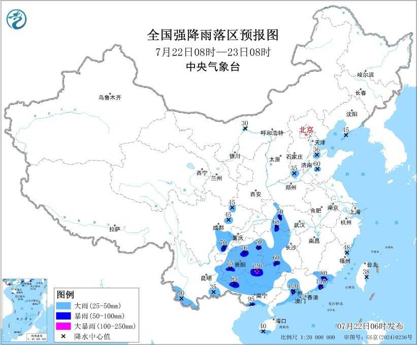 中央气象台7月22日06时发布暴雨蓝色预警: