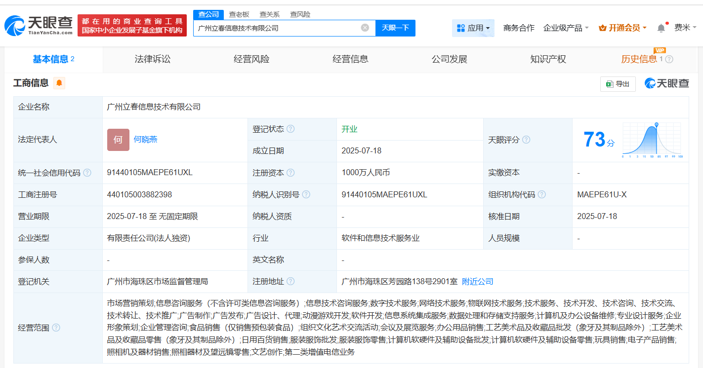 近日,广州立春信息技术有限公司成立,法定代表人为何晓燕,注册资本1000万元,业务涵盖市场营销策划、信息技术咨询等,由蚂蚁集团旗下杭州蚂蚁未来科技全资持股。