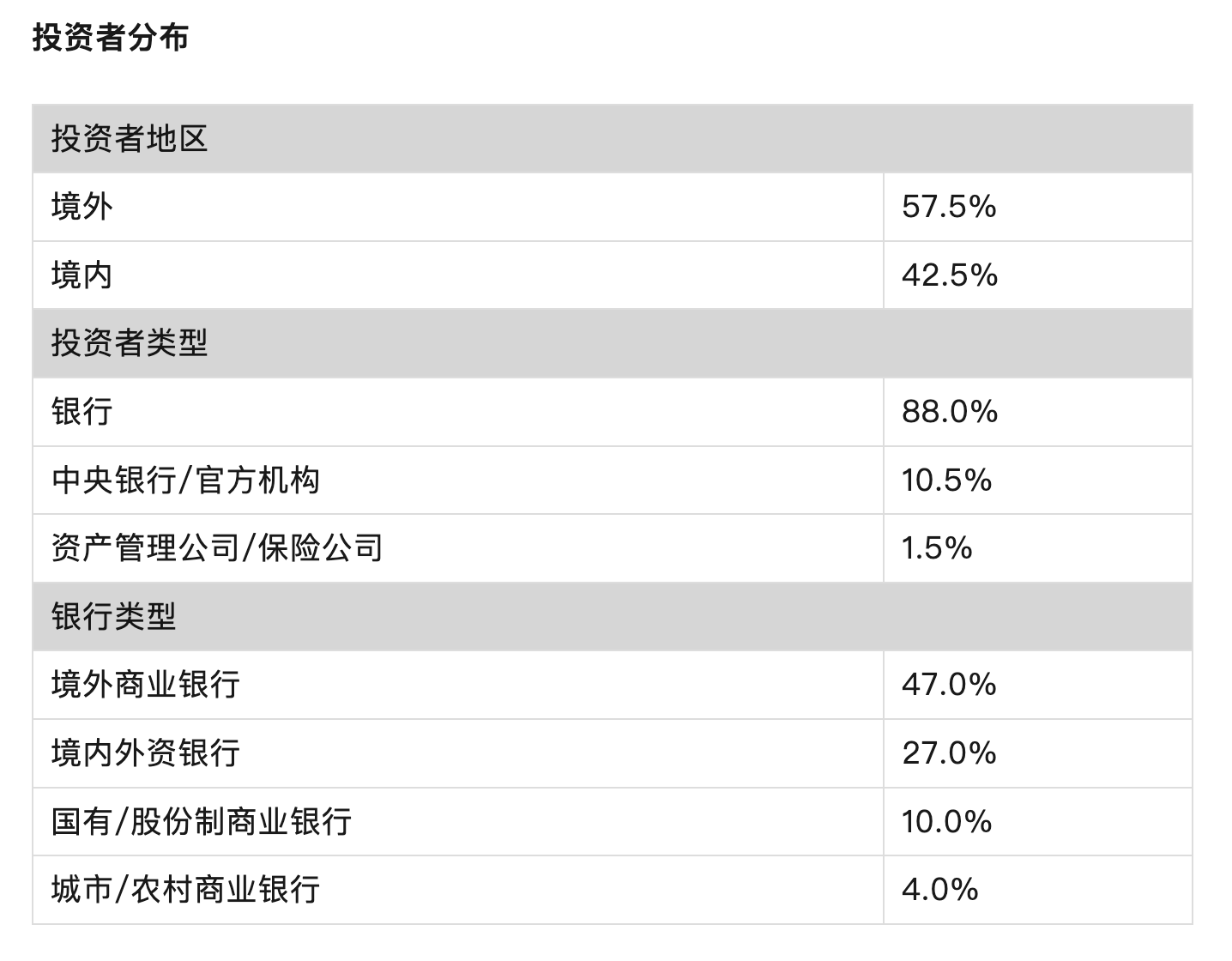 境外投资者获得了57.5%的最终配售份额,境内投资者占42.5%。其中,境外商业银行占比最高,达47%;其次为境内外资银行,占比27%。