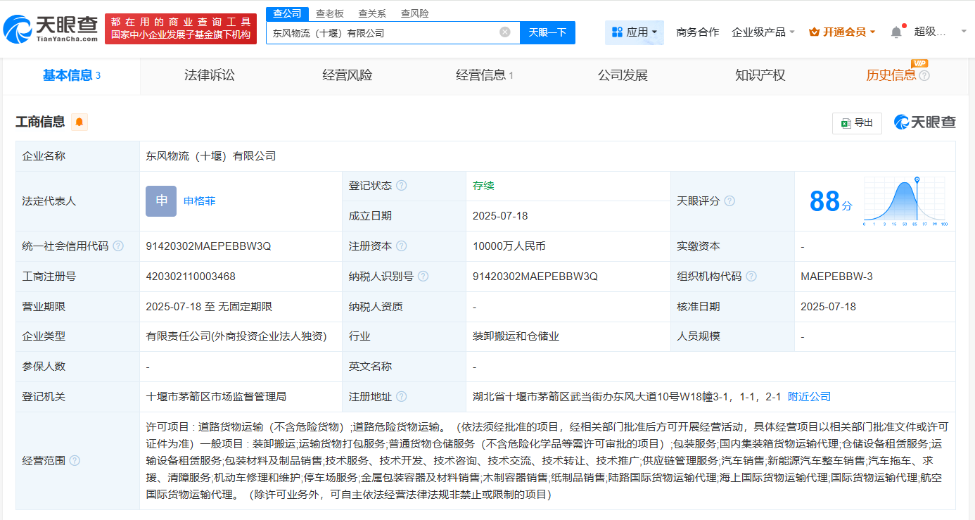 天眼查App显示,东风物流(十堰)有限公司成立,注册资本1亿元,业务涵盖国内集装箱货物运输代理、供应链管理、汽车及新能源汽车销售等,由东风物流集团全资持股。