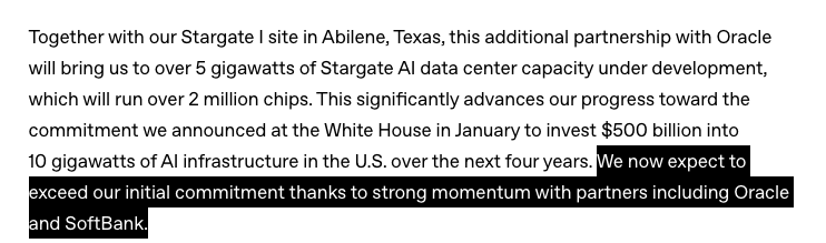 OpenAI特别强调,今年1月与软银、甲骨文等合作伙伴在白宫做出的承诺,是未来4年在美国投资5000亿美元建设10吉瓦的人工智能基础设施。得益于合作伙伴的强劲势头,现在预期“星际之门”将超越最初的承诺。