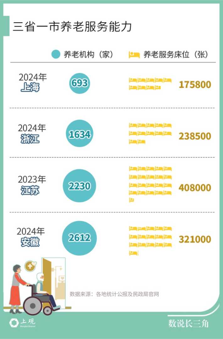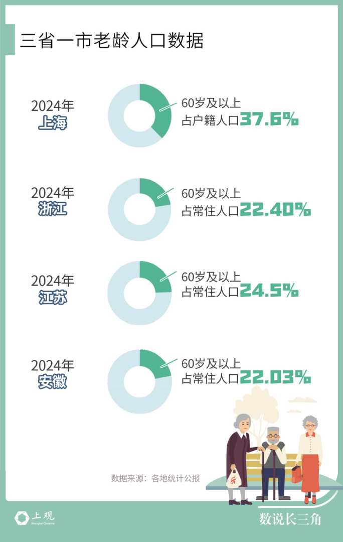 根据相关数据统计,长三角地区的老年人口占比延续上升趋势。截至2023年底,三省一市共有60周岁以上老年人5235.44万人,占总户籍人口的25.4%,高于全国平均水平。