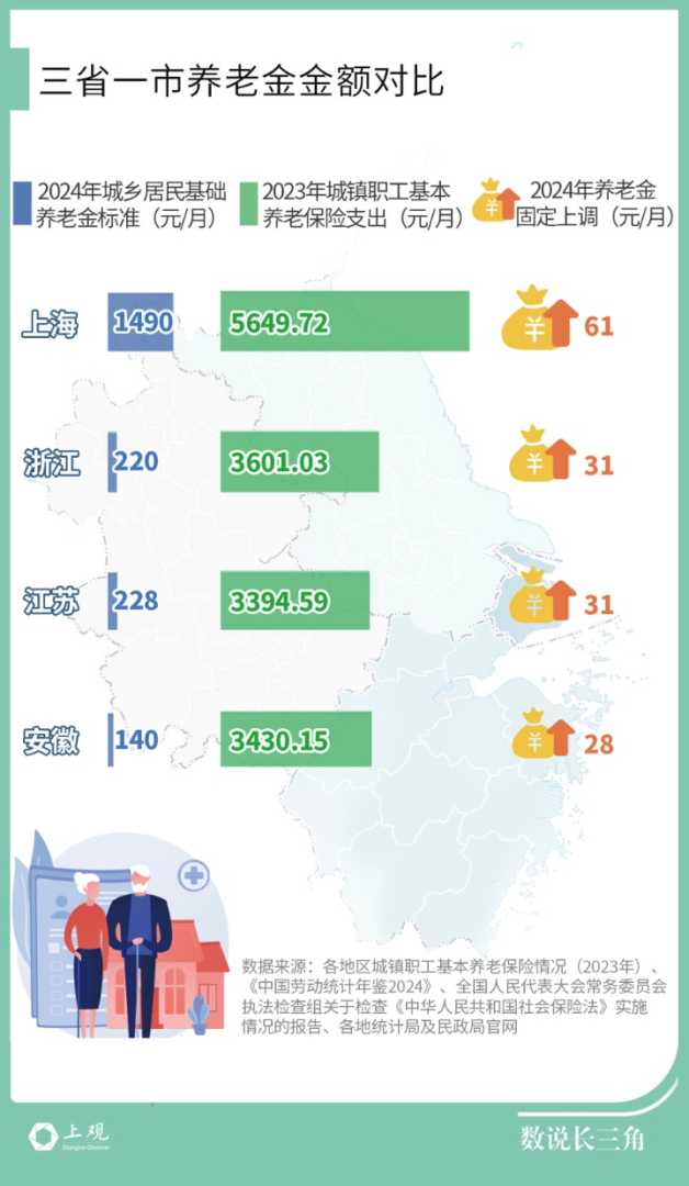 与国家养老金调整的步伐一样,三省一市的养老金也在不断上调,上涨幅度均领先全国。从城乡居民基础养老金最低标准来看,2024年,上海为1490元/月,江苏为228元/月,浙江为220元/月,安徽为140元/月,均超出全国基数123元/月。值得注意的是,过去10年间,江苏的这一标准涨幅居首。2015年,江苏最低标准为90元/月,到2024年涨幅为153.3%。而上海的涨幅为131%,安徽涨幅为100%,浙江涨幅为83.3%,均超过全国涨幅(75.7%)。