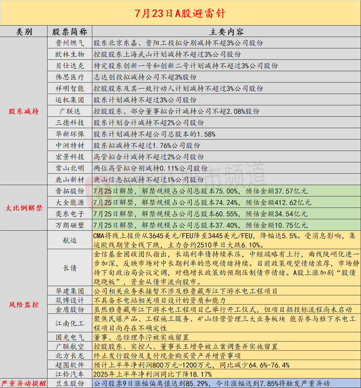 导读:财联社7月23日投资避雷针,A股及海外市场风险事件频发。国内经济方面,债市承压,中长期利率悲观情绪再起,海运巨头降价致集运欧线期货重挫6%。公司方面,华建集团、筑博设计等澄清不涉及雅鲁藏布江下游水电项目。海外市场,美股涨跌不一,德州仪器盘后大跌逾12%,WTI原油期货合约收跌1.47%。