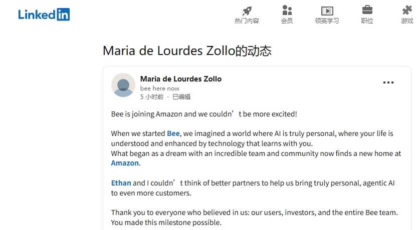 Bee联合创始人卢尔德·佐罗在领英上宣布了这笔收购,他表示:“当我们创立Bee时,我们设想了一个AI真正个人化的世界,它读懂你的生活,又随你一同进化。如今,这段征程将在亚马逊开启新篇章。”