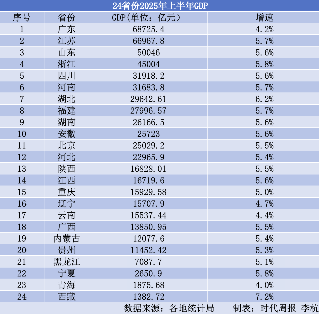 各地2025年上半年GDP数据陆续公布。截至发稿,共有24个省(区、市)公布相关数据。广东继续领先,实现地区生产总值(GDP)68725.4亿元,同比增长4.2%。江苏紧随其后,达到66967.8亿元。山东和浙江则分列第三、四位。其中,山东上半年GDP首次突破5万亿元大关,达到50026亿元,同比增长5.6%;浙江GDP为45004亿元,同比增长5.8%。四川继续稳居全国第五,上半年GDP比河南多出了234.4亿元。