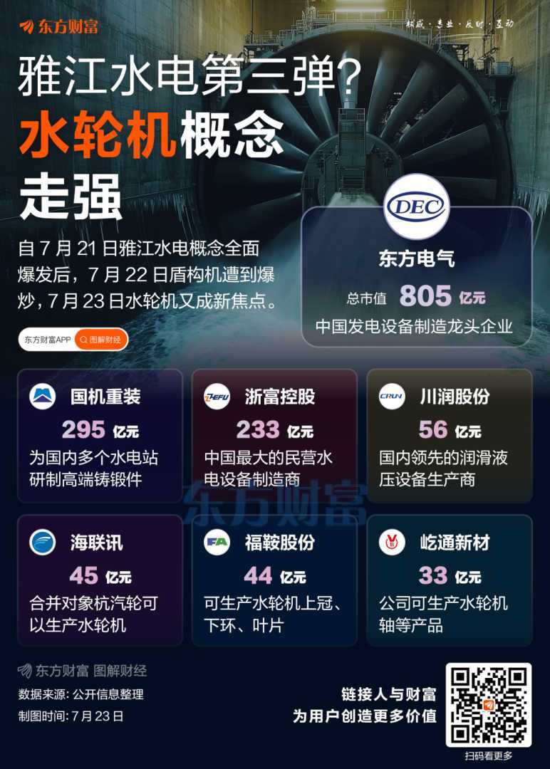 自7月21日雅江水电概念全面爆发后,资金开始向细分方向扩散,盾构机在7月22日受到追捧,7月23日水轮机概念又成新焦点,当天东方电气、国机重装、浙富控股等龙头股纷纷涨停,市场热度持续攀升。