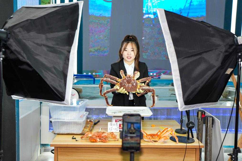 2024年9月20日,在吉林省珲春市的帝王蟹保税店内,工作人员进行网络直播售卖帝王蟹。新华社记者许畅摄