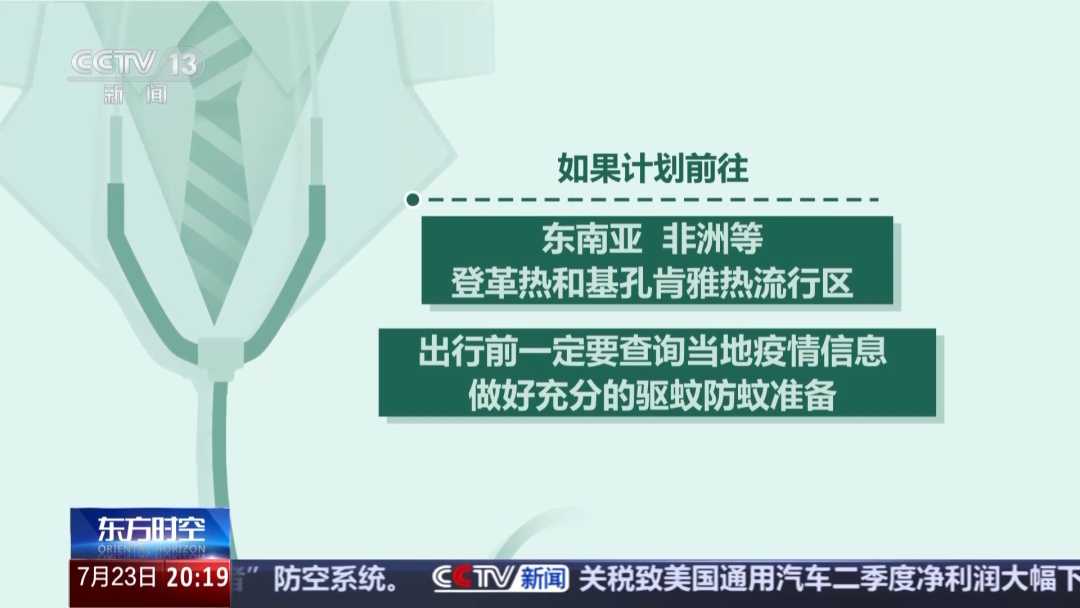 专家提示,如果计划前往东南亚、非洲等流行区,出行前一定要查询当地疫情信息,做好充分的驱蚊防蚊准备。归国后14天内做好健康监测,一旦出现相关症状,应立即就医并告知旅行史和蚊虫叮咬史。