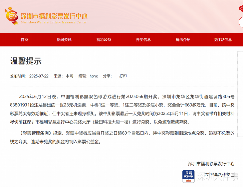 7月22日,深圳福彩中心提醒,2025年6月12日晚双色球第2025066期开奖,龙华区一投注站售出28元机选票中得660多万大奖,兑奖有效期临近,中奖者尚未领奖,最后兑奖日为2025年8月11日。