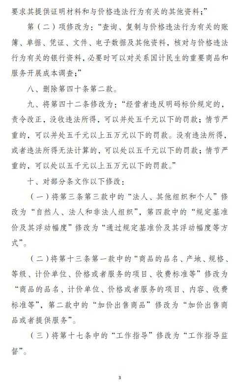 (三)健全价格违法行为法律责任。一是调整对经营者不正当价格行为的处罚规定,提高经营者违反明码标价规定的处罚标准。二是明确经营者拒绝或者虚假提供成本监审、调查等资料的法律责任。