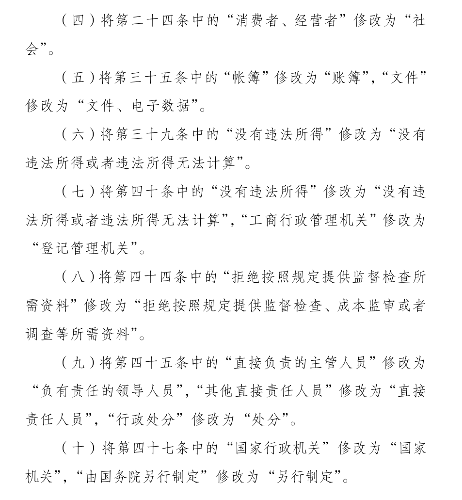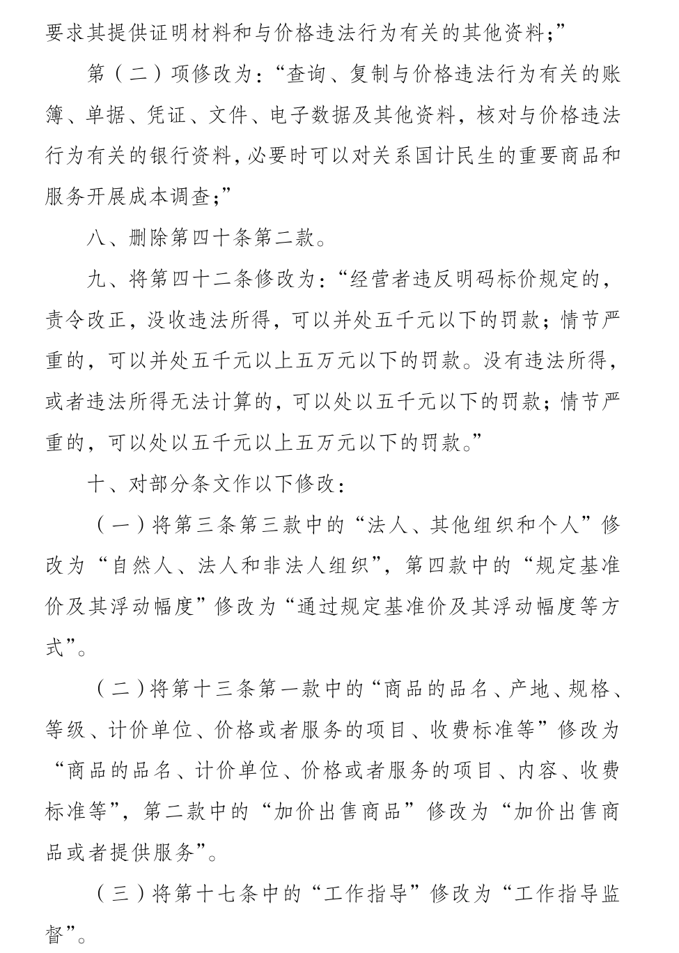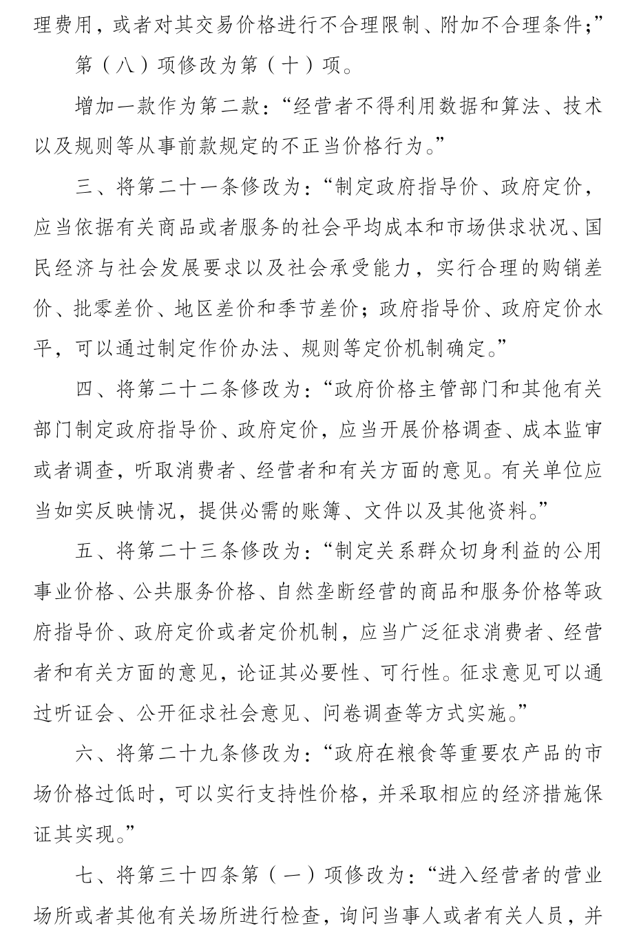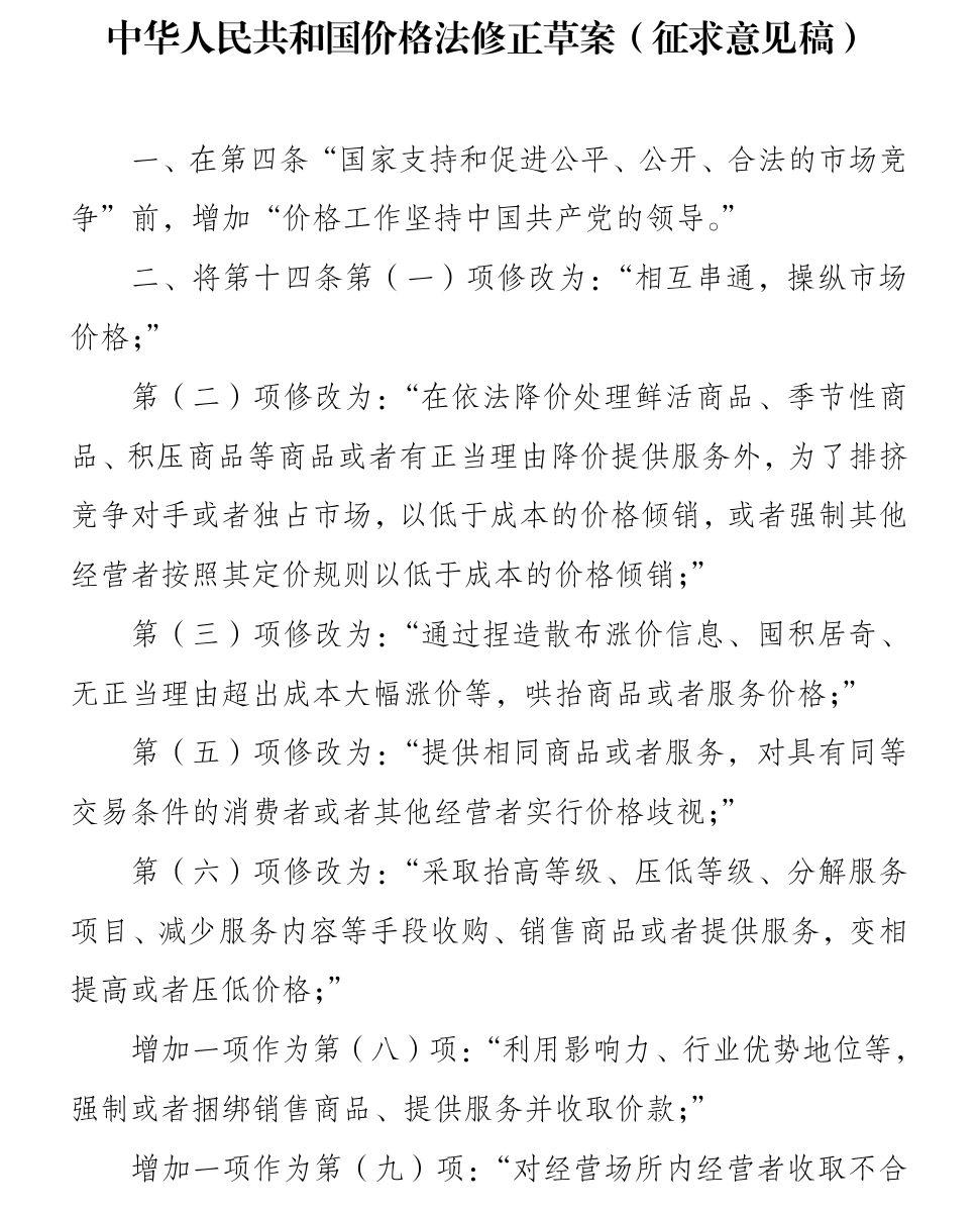 修正草案起草说明指出,修正草案共10条,主要涉及三方面内容。具体包括:完善政府定价相关内容,明确政府指导价形式,明确定价机关可通过制定定价机制确定政府定价水平,明确成本监审作为政府制定价格的重要程序,新增公开征求社会意见等听取意见方式;进一步明确不正当价格行为认定标准,完善低价倾销等认定标准,治理“内卷式”竞争,强化对经营场所经营者价格行为的规范;健全价格违法行为法律责任,调整对经营者不正当价格行为的处罚规定,明确经营者拒绝或者虚假提供成本监审等资料的法律责任。