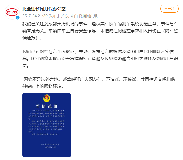 7月24日,据比亚迪新闻打假办公室:已关注到成都天府机场事件,经核实该车刹车系统功能正常,事件与车辆本身无关。车辆由车主自行安全停靠,未造成任何碰撞事故和人员伤亡(附:警情通报)。