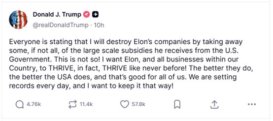 近期,全球首富马斯克和美国总统特朗普这两个曾亲密无间的盟友之间的公然决裂引发全球关注,也让投资者担心,由于得罪了特朗普,马斯克旗下公司可能会受到政策打压。