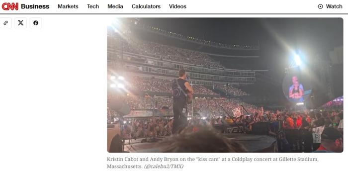 据美国消费者与商业频道(CNBC)24日报道,美国IT公司Astronomer在一份声明中证实,该公司人力资源总监克里斯汀·卡伯特(Kristin Cabot)已辞职。此前,克里斯汀·卡伯特与该公司首席执行官(CEO)安迪·拜伦在“酷玩乐队”的演唱会上被拍到亲密搂抱的画面,该片段显示两人在巨型屏幕上拥抱,随后突然低头躲避镜头。