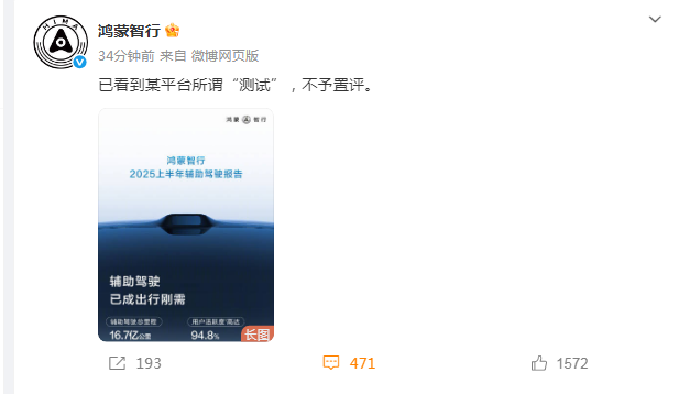 据最新消息,鸿蒙智行官方微博发文称,已看到某平台所谓“测试”,称“不予置评”。