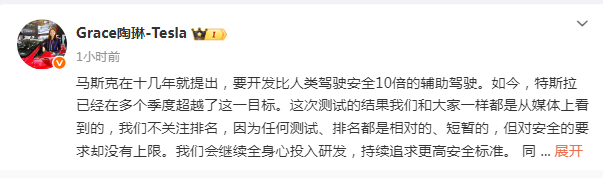 此外,特斯拉公司副总裁@Grace陶琳-Tesla 发文称:“马斯克在十几年就提出,要开发比人类驾驶安全10倍的辅助驾驶。如今,特斯拉已经在多个季度超越了这一目标。这次测试的结果我们和大家一样都是从媒体上看到的,我们不关注排名,因为任何测试、排名都是相对的、短暂的,但对安全的要求却没有上限。我们会继续全身心投入研发,持续追求更高安全标准。同时,也希望大家看到,这次测试的本意并不是排名,而是提醒大家专注路况,安全第一!”