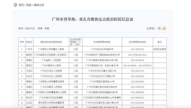 7月25日,广州市卫生健康委员会官网公布了一份关于广州市登革热、基孔肯雅热定点收治医院信息表,共有13家定点收治医院,为市民提供了明确的就医指引。