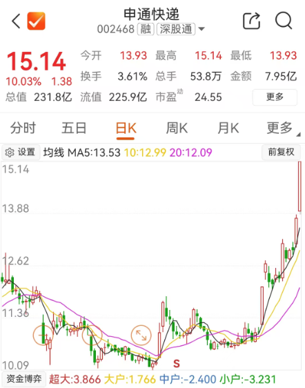 值得一提的是,7月25日开盘后,申通快递股价快速上攻并封住涨停,股价收于每股15.14元,创下近三年来的新高,公司市值达到231.76亿元。