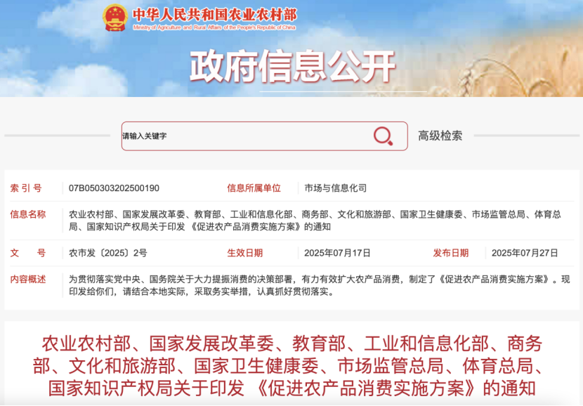 7月27日,据农业农村部网站消息,农业农村部等十部门联合印发《促进农产品消费实施方案》,部署九方面举措,释放多样化、品质化、差异化消费潜力,引领供需结构升级,有力有效扩大农产品消费。