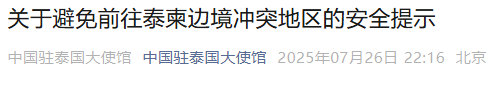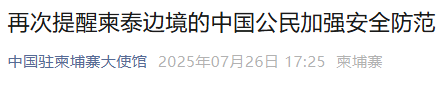 7月26日,中国驻泰国大使馆发布《关于避免前往泰柬边境冲突地区的安全提示》:目前泰柬边境交火仍在持续,泰方已在尖竹汶府和达叻府部分地区实施戒严。中国驻泰使馆再次提醒在泰中国公民,特别是靠近冲突地区的中国公民密切关注形势发展,注意自身安全,避免前往泰柬边境有关区域。已在当地的人员和机构应关注所在地区政府的安全指引,注意及时避险和转移。如遇紧急情况,请及时报警并向驻泰使领馆寻求协助。