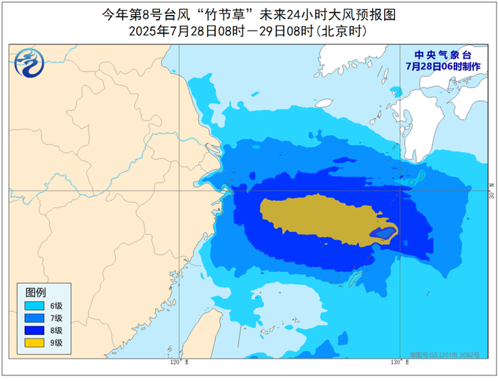 大风预报:7月28日08时至29日08时,东海大部、台湾以东洋面、杭州湾、长江口区、上海沿海、江苏南部沿海、浙江沿海将有7-8级、阵风9-10级的大风;台风中心经过的部分海区风力可达9级、阵风10-11级。