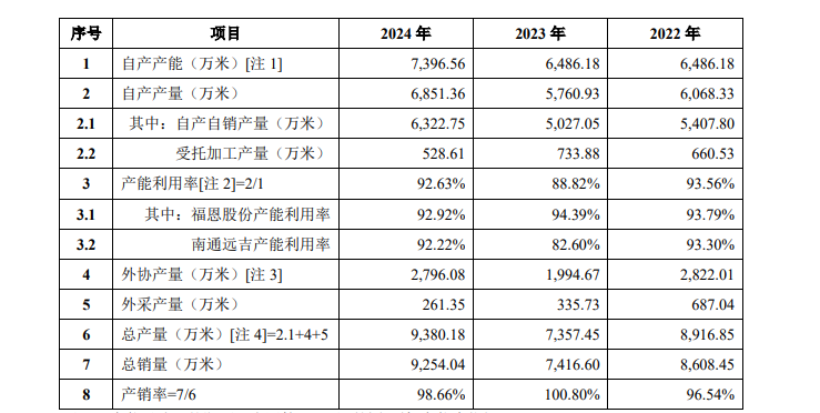 《财中社》注意到,虽然收入变化不大,但福恩股份产能利用率不低。2022-2024年,公司自产产量分别为6068万米、5761万米和6851万米,产能利用率分别为93.6%、88.8%和92.6%。