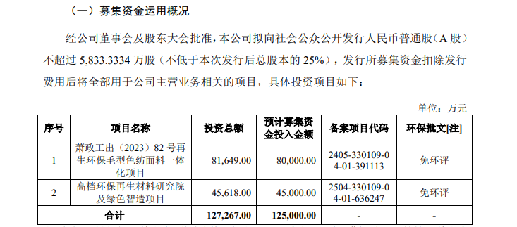 根据招股书,此次IPO,福恩股份计划募资12.5亿元。其中,8亿元用于萧政工出(2023)82号再生环保毛型色纺面料一体化项目(下称“色纺面料一体化项目”),4.5亿元用于高档环保再生材料研究院及绿色智造项目。