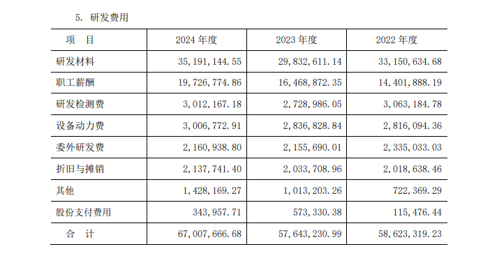 研发投入上,2022-2024年,公司研发费用分别为5862万元、5764万元和6701万元,占当期营业收入的比重分别为3.3%、3.8%和3.7%,达到了不低于3%的最低标准。