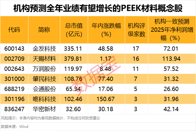 据证券时报·数据宝统计,PEEK材料概念股年内平均上涨31.95%,唯科科技、肇民科技、大洋生物的股价年内涨幅居前,均涨超50%,市场表现亮眼。