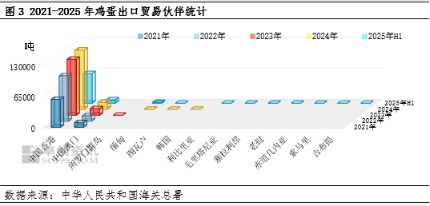 新兴市场突破,贸易伙伴数量继续增多,鸡蛋需求提升。2021-2022年我国鲜鸡蛋出口贸易伙伴为2个,分别为中国香港和中国澳门,2023年贸易伙伴增加至3个,新增所罗门群岛。2024年我国鸡蛋出口贸易伙伴增加至5个,其中贸易伙伴除中国香港和中国澳门外,增加缅甸、图瓦卢和韩国。2025年受国际禽流感频发,国际鸡蛋价格偏高影响,上半年我国鸡蛋出口贸易伙伴数量增加7个,其中新增贸易伙伴为:利比里亚、毛里塔尼亚、塞拉利昂、赤道几内亚(西非地区),索马里、吉布提(东非地区),老挝。受非洲等新兴市场的突破,上半年我国鸡蛋贸易伙伴增加至11个。鸡蛋出口贸易伙伴数量的增加,是导致我国鸡蛋出口量增多的重要因素。