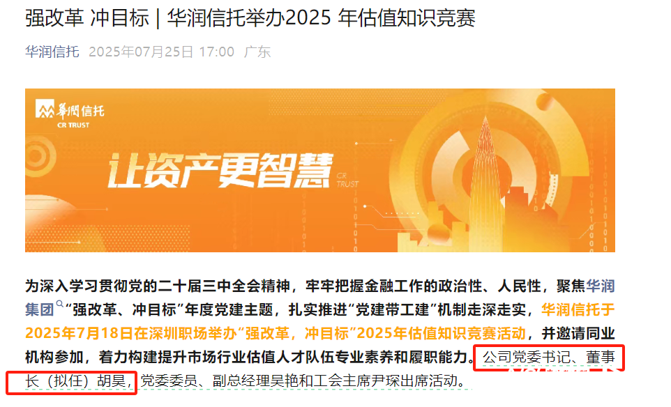 日前,华润深国投信托有限公司(以下简称“华润信托”)于官方公众号发布了名为《强改革冲目标 | 华润信托举办2025 年估值知识竞赛》的文章。