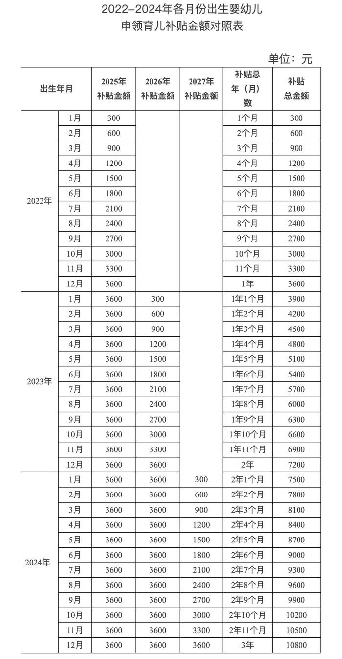(1)对于2025年1月1日及以后出生的婴幼儿,可连续申领3年补贴,共计10800元。