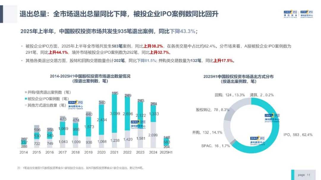 退出方面,2025年上半年共发生935笔退出案例,同比下降43.3%,其中被投企业IPO案例数为583笔,占比62.4%。值得注意的是,2025年上半年中企被投企业港股及美股IPO案例数达到292笔,同比上升224.4%。