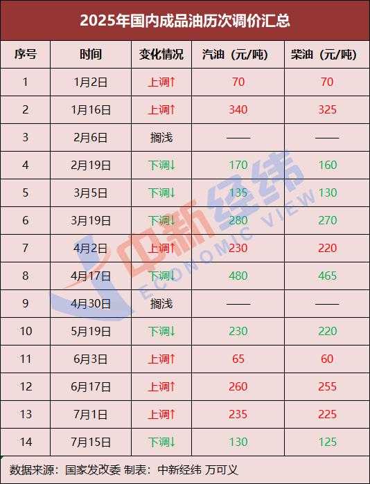 中新经纬注意到,今年以来,国内油价已经历十四轮调价窗口,分别为“六涨六跌两搁浅”。涨跌互抵后,国内汽、柴油价格每吨较去年底分别下调225元、215元。若本轮调整搁浅,2025年调价格局将变为“六涨六跌三搁浅”。