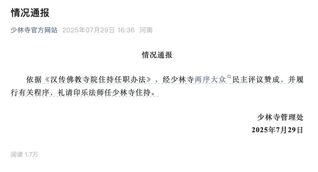 7月29日,据公众号“少林寺官方网站”消息,依据《汉传佛教寺院住持任职办法》,经少林寺两序大众民主评议赞成,并履行有关程序,礼请印乐法师任少林寺住持。这一人事变动不仅体现了少林寺内部的民主决策机制,也彰显了佛教界对人才选拔的严谨态度。