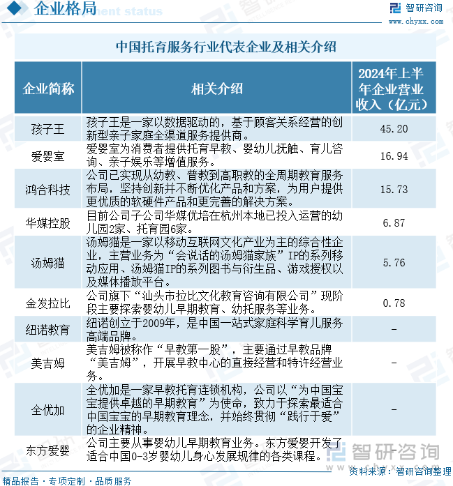 目前我国托育服务行业主要企业包括孩子王、爱婴室、鸿合科技、华媒控股、汤姆猫、金发拉比等。部分头部企业如孩子王、爱婴室、华媒控股等正通过“自建+并购”的方式抢占市场。孩子王在国内母婴零售行业中位居前列,通过“成长加”平台引入托育相关服务,在12城试点社区嵌入式托育,已并购乐友国际实现线下市场扩张。爱婴室以母婴商品销售及相关服务为主营业务,截至今年6月,已在上海、杭州等城市开设了32家直营托育中心。华媒控股打造的幼托教育品牌华媒一米国,与当地社区联手打造公建民办普惠性托育机构,目前下属托育园有在杭州运营的6家。