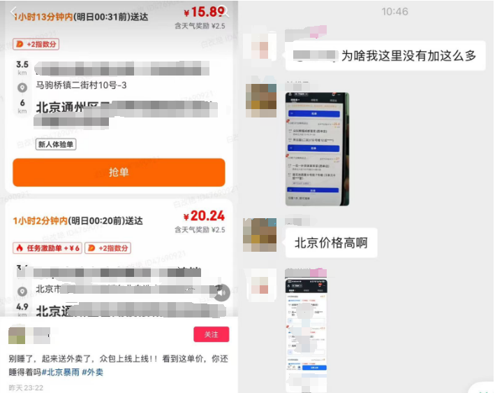 昨日晚间,北京大部分地区降雨达到暴雨量级。极端天气下,骑手们交流讨论装备,手机防水袋最重要。有受访骑手直言,能挣钱就行,暴雨其实和暴晒一样。