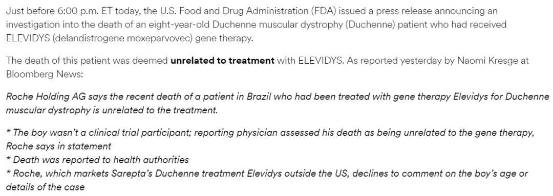 最新转机出现在FDA完成调查之后,官方认定巴西一名8岁男孩的死亡与Elevidys无直接关联,并建议解除自愿性发货禁令。