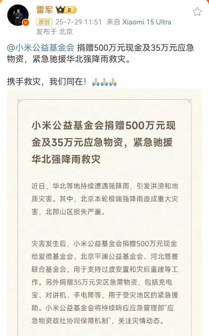 小米公益基金会微博7月29日发文称,为应对华北地区强降雨引发的洪涝和地质灾害,捐赠了500万元现金及35万元应急物资,用于支持过渡安置、灾后重建工作以及提供灾区急需的紧急援助。此次捐赠的应急物资包括充电宝、对讲机、手电筒等,以满足受灾地区的紧急需求。