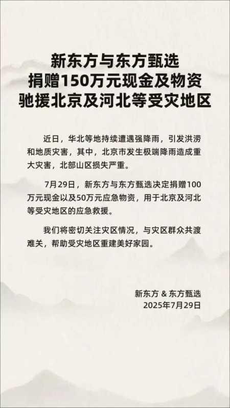 7月29日,新东方与东方甄选决定捐赠100万元现金以及50万元应急物资,用于北京及河北等受灾地区的应急救援。