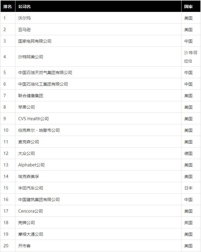 7月29日,最新《财富》世界500强排行榜出炉。今年500强企业营业收入总和约为41.7万亿美元,超过全球GDP的三分之一,比去年增长约1.8%。此次上榜门槛(最低销售收入)从321亿美元增长至322亿美元。沃尔玛连续第十二年成为全球最大公司,亚马逊保持第二。中国国家电网继续位列第三,排在第四和第五位的分别是沙特阿美和中国石油。