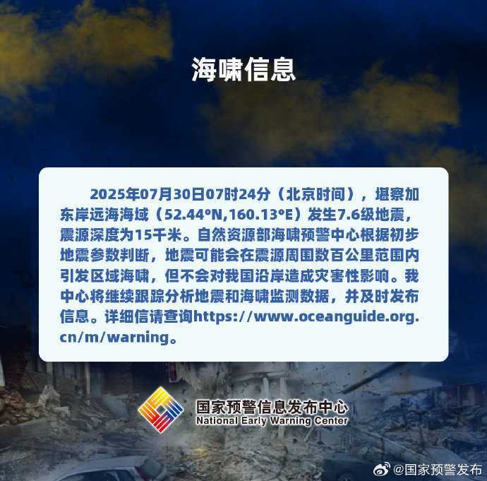 国家海洋预报台消息,07月30日堪察加东岸远海海域发生7.6级地震,震源深度15千米,可能引发区域海啸,但不会对我国沿岸造成灾害性影响。