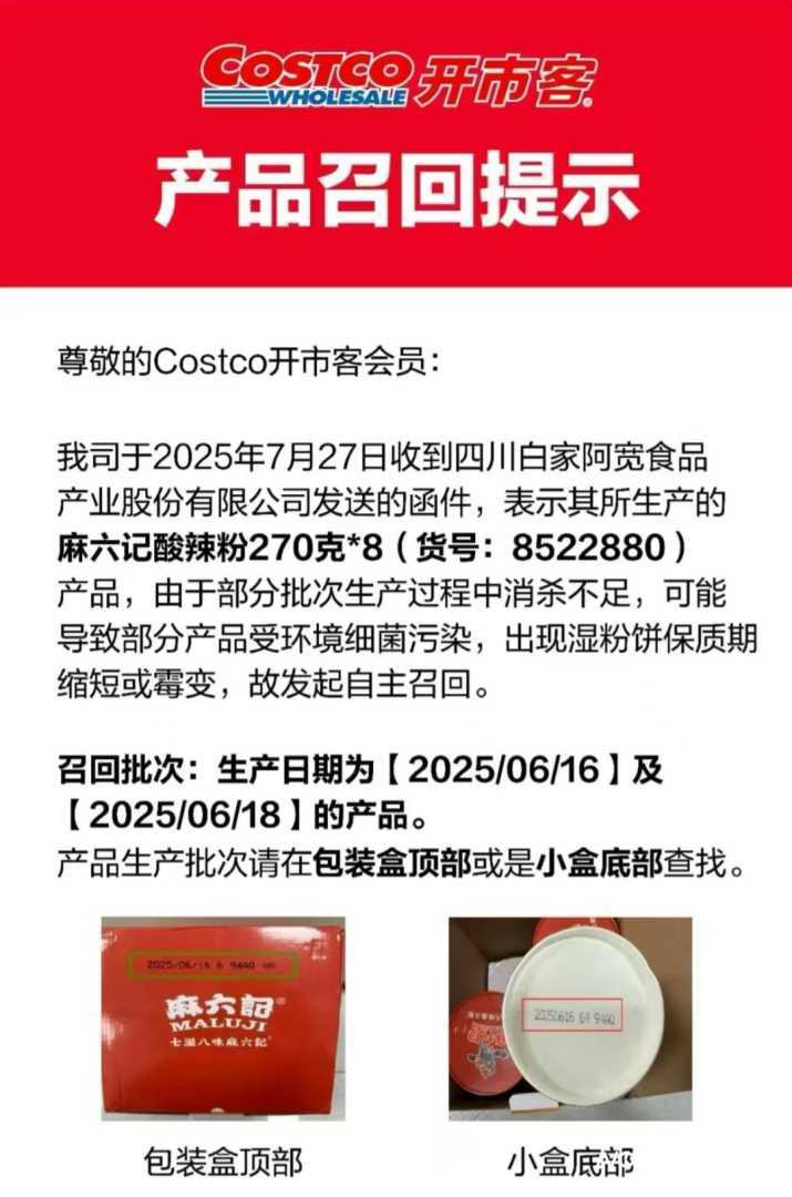 近日,麻六记酸辣粉部分产品受环境细菌污染出现发霉、遭会员制超市Costco(即“开市客”)所有门店下架引发较大关注。7月27日,麻六记酸辣粉代工商四川白家阿宽食品产业股份有限公司(下称“阿宽食品”)最先发布道歉声明,7月28日下午,麻六记也道歉了。两家公司均承认,麻六记酸辣粉两批次产品存在问题,已全面下架,启动召回。