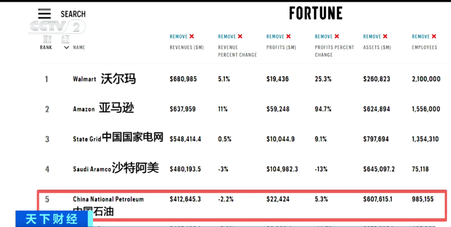 根据最新公布的《财富》世界500强排行榜,此次上榜门槛从321亿美元增长至322亿美元。上榜公司的资产总额和净资产总额均达到自《财富》世界500强排行榜创立以来的最高值。沃尔玛以近6810亿美元的营收额连续第十二年成为全球最大公司,亚马逊以约6380亿美元的营收额位居第二。中国国家电网、沙特阿美和中国石油位列第三至五位。