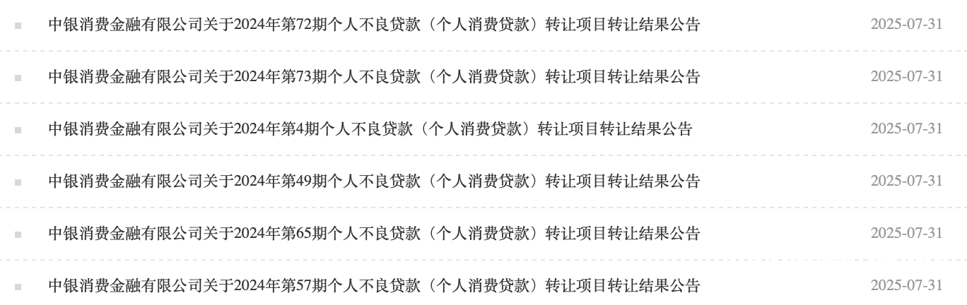 为加快不良资产出清,中银消金加大集中挂牌转让力度。7月31日,中银消金又在银登网连续披露十余个不良资产包,当前2024年的不良资产包已披露至73期。