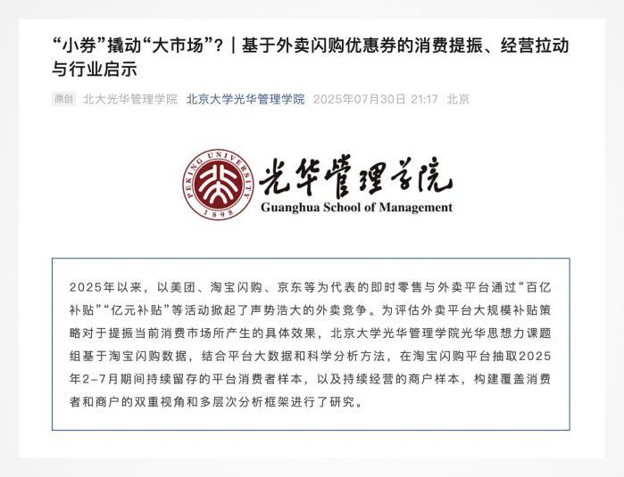 7月30日,北大光华管理学院微信公众号发布报告称,闪购优惠券的消费拉动作用存在显著的溢出效应,每1元的有效闪购补贴带动了消费者6.76元的额外消费;研究还发现,闪购渗透率与地区行业层面餐饮商家平均线下周营收正相关,未发现挤占堂食的统计证据;闪购优惠券对参与商户在线上、线下营收都有正向拉动作用,且对营收规模最小的25%商户的拉动作用最强。
