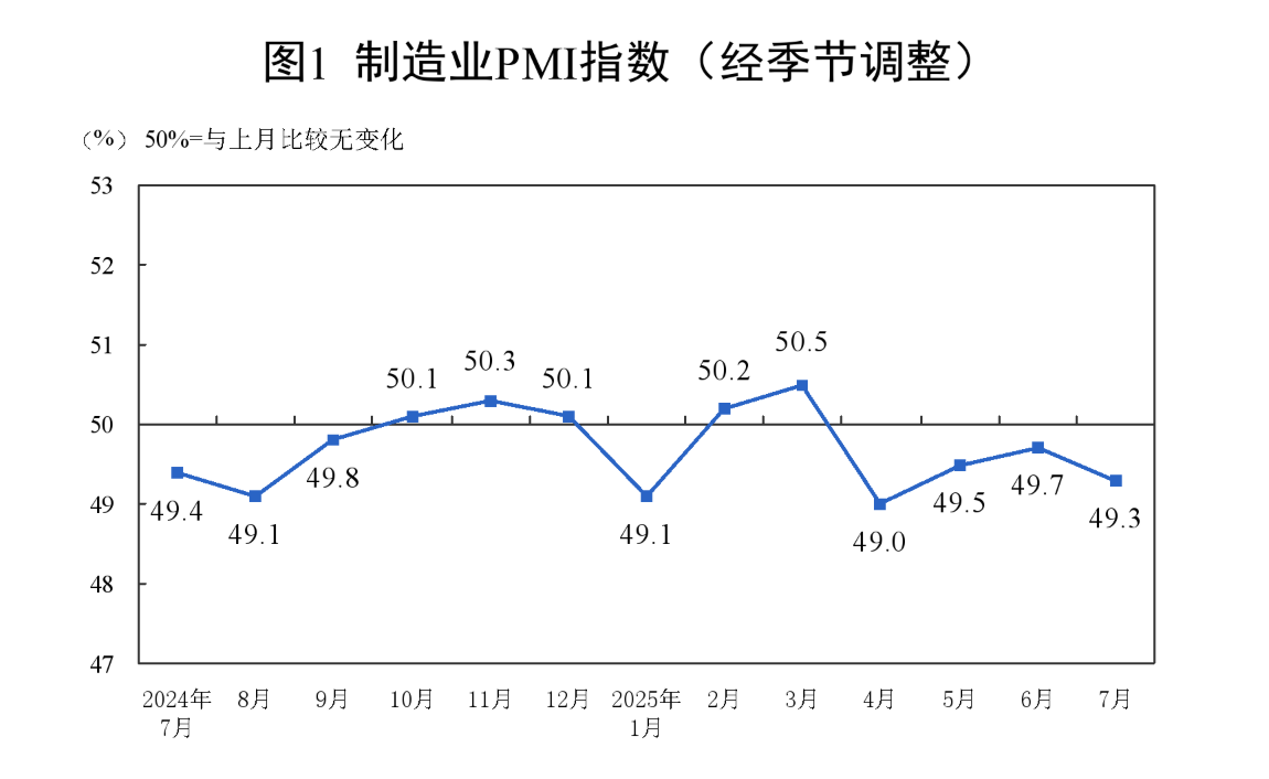 国家统计局数据显示,7月制造业PMI为49.3%,连续四月低于荣枯线,非制造业商务活动指数为50.1%。但价格类指数回升,反内卷成效初显,企业对市场发展信心增强。