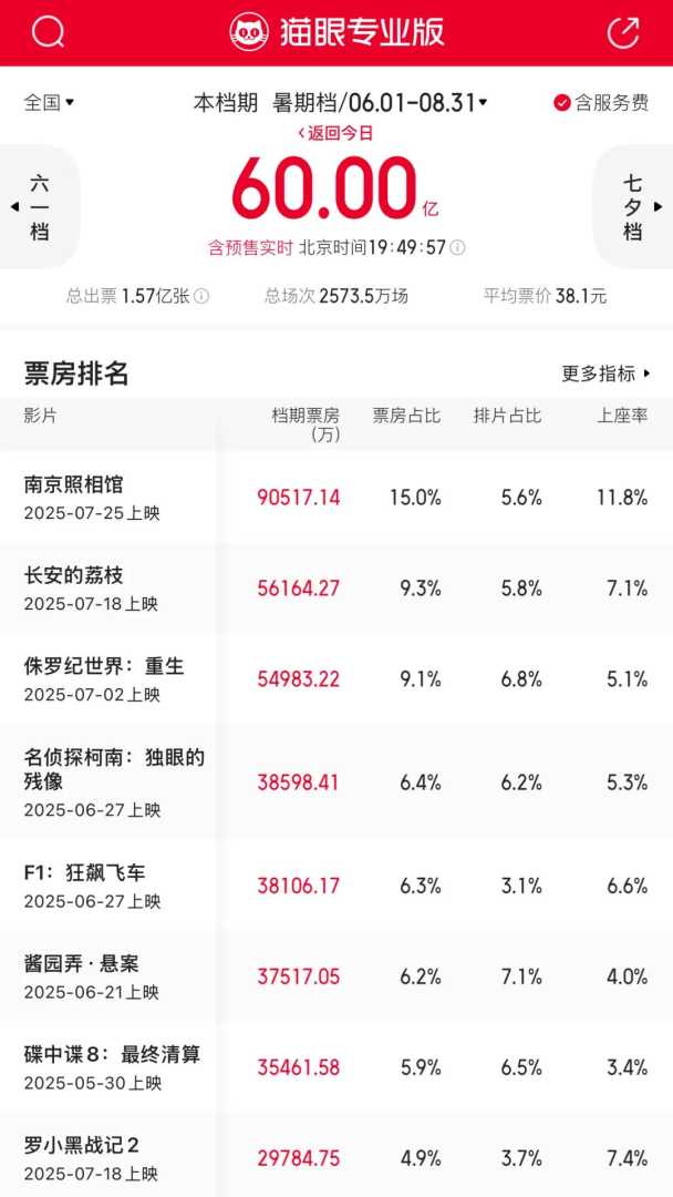 2025暑期档票房破60亿,《南京照相馆》成爆款引爆A股